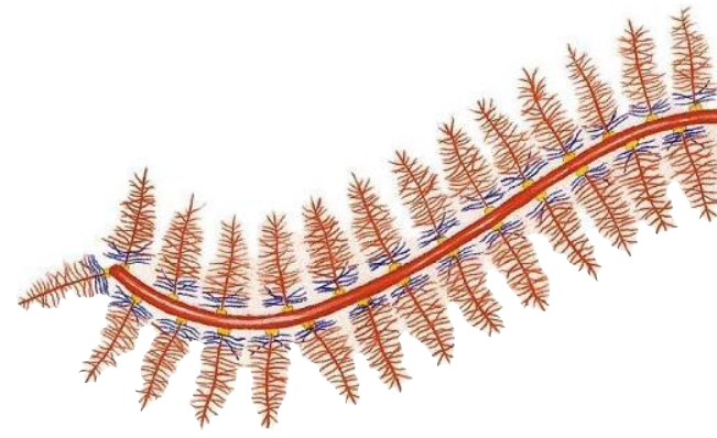 The fibers are made of proteins. The watery ground substance is mostly- you guessed it- water. Ground substance also contains molecules made of sugar and amino acids called Glycosaminoglycans or GAGs. GAGs are amazing water organizers! Their shape has much to do with this ability. GAGs are shaped like fern leaves with fronds branching off of a spine in the middle. They line up microscopic droplets of water all along their “fronds.” We want fronds that are nicely spaced from each other because of the water they are holding. In healthy connective tissue the fern like fronds are just-Goldilocks-right. In other words, in healthy fascia the GAGs have organized enough water to keep things open and moving. Picture happy “ferny” GAGs swaying in the ground substance.